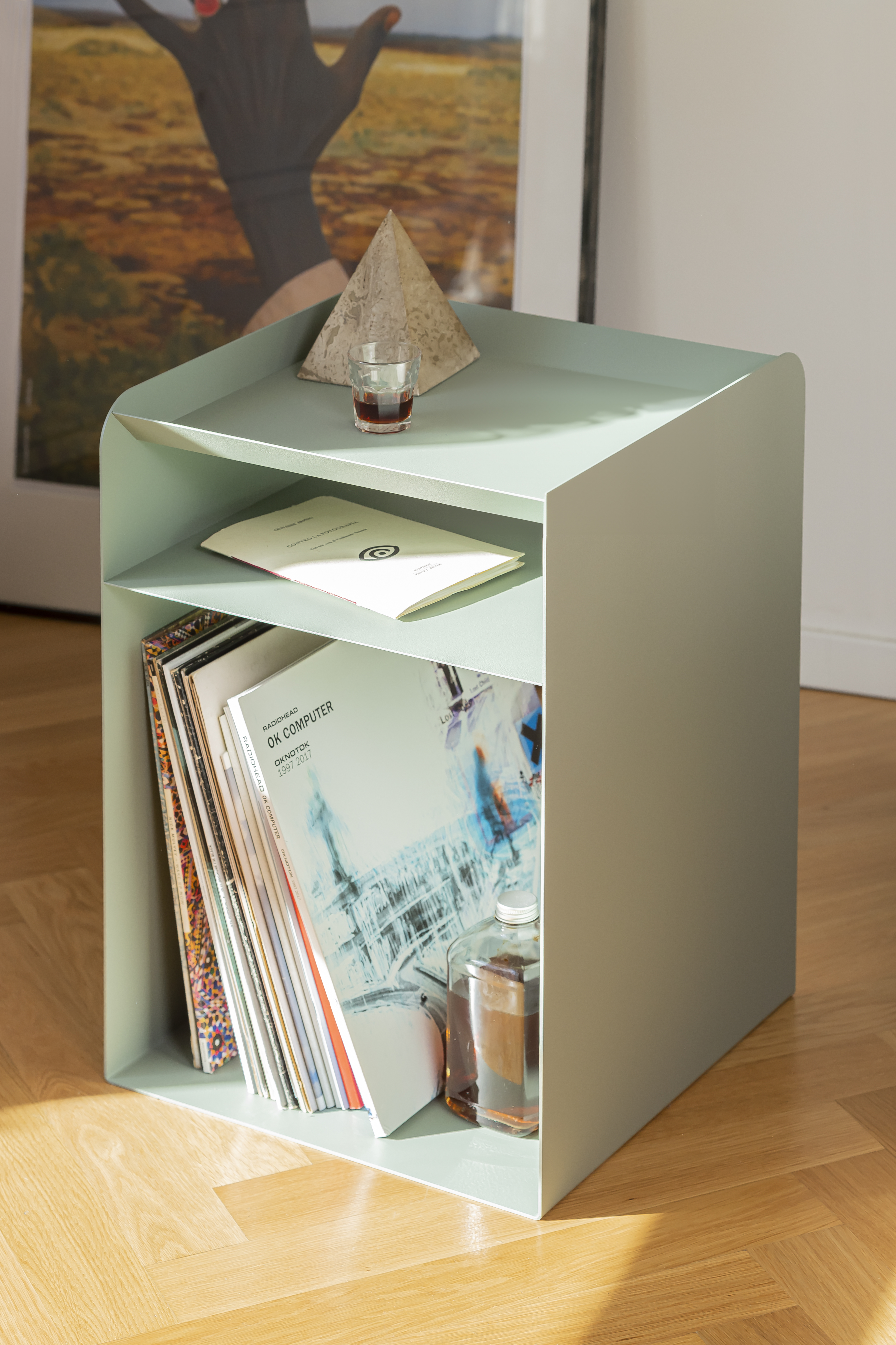 Platò side table features a top inspired by utility trays ('plateau' in French), providing a reliable place to set items when being