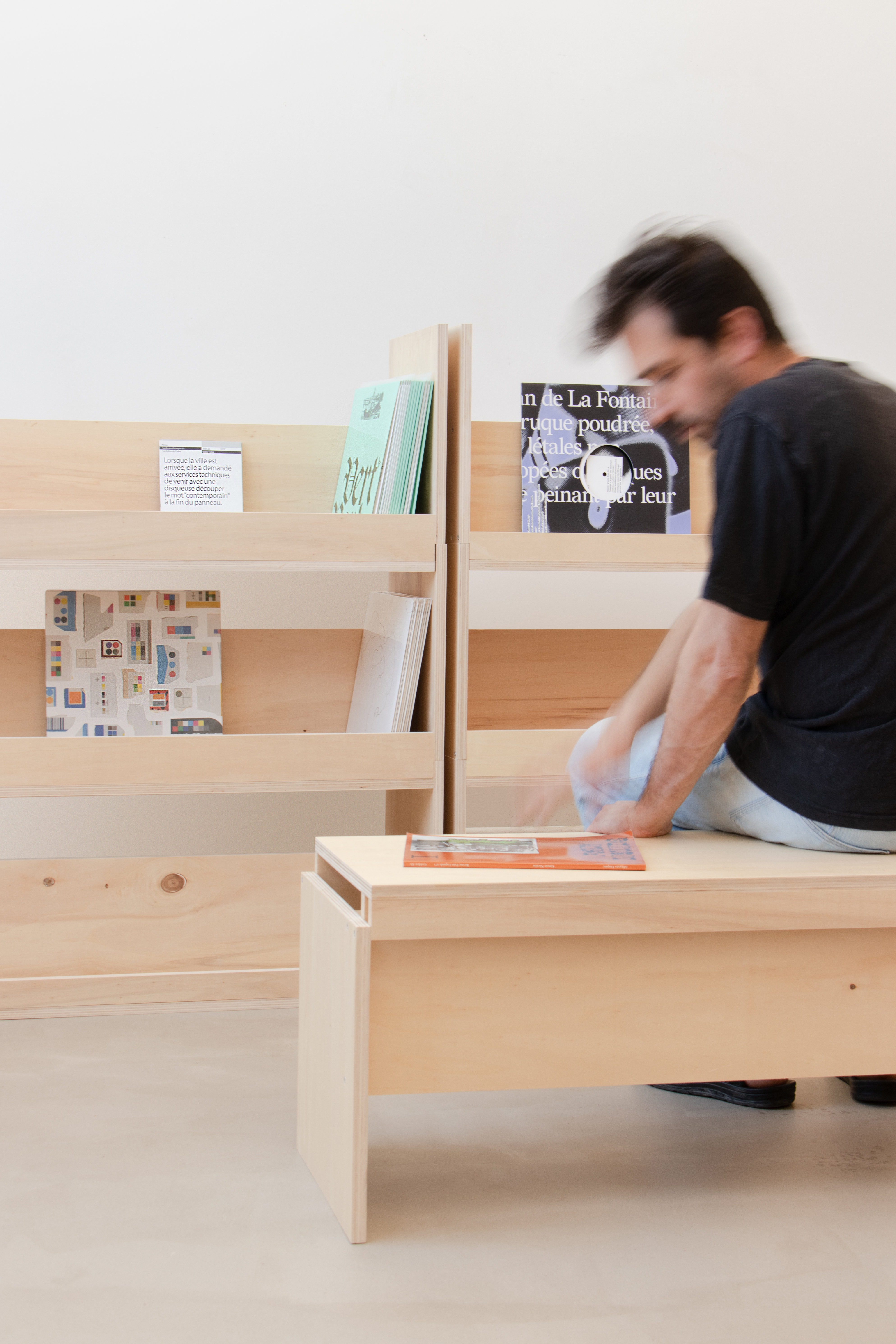Modular shelving system designed for visual artist Noémie Pilo in 2024 in order for her to display a set of volumes and experiments. Single units working indepedently as benches can be seamlessly connected to turn it into shelves. The shelves are assembled upside down, starting from the top then flipping it over once assembled.